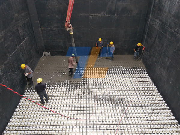 整體澆筑濾板制作與安裝:無接縫濾板由于在現場制作,因此工期短,質量易監控,其施工必須遵循以下程序:池體實測一模板取樣一模板安裝一鋼筋綁扎一預埋座安裝一清理一檢查一搭設操作平臺一混凝土澆搗一初凝一旋松預埋座施工蓋一養護一打開預埋座施工蓋一布水區進水至預埋座內螺紋平面--置入帶調節螺紋的濾桿調試水平一檢查一安裝自鎖濾帽。