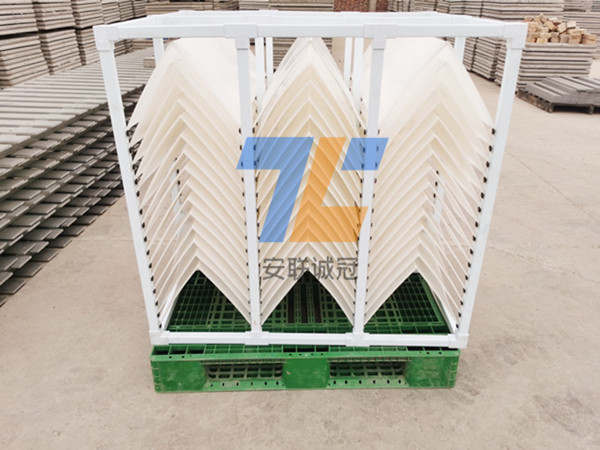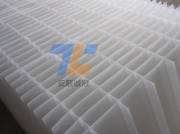 主要由共聚及聚丙烯材料混合制成。從淺層理論的基礎講,在斜板上部設置沉淀距離合理的沉淀段,在下部控制斜板的幾何形狀,使斜板下部形成穩定的接觸絮凝段,通過接觸作用和淺池沉淀機理達到礬花與水分離的目的。各種間距斜板填料均是通過不同髙度的塑料肋條來支撐斜板片,肋條與斜板熱熔焊接,每兩層斜板片之間需要多根肋條支撐,組裝工藝復雜,而且傳統斜板內部水流流道成矩形,常適用于上向流沉淀池。