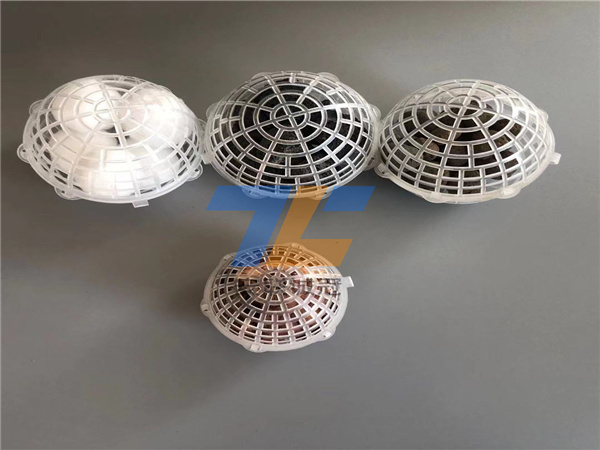 分內(nèi)外雙層球體,外部為網(wǎng)狀球體,內(nèi)部為旋轉(zhuǎn)球體,在污水的生化處理中具有全立體結(jié)構(gòu),比表面積大,易掛膜,不堵塞,微生物易生成,易更換,耐酸堿,抗老化,不受水流影響,使用壽命長(zhǎng),剩余污泥少,直接投放,無(wú)須固定,安裝方便。主要起生物膜載體的作用,同時(shí)兼有截留懸浮物的作用,具有生物附著力強(qiáng)、比表面積大、孔隙率高、化學(xué)和生物穩(wěn)定性能好、經(jīng)久耐用,不溶出有害物、不引起二次污染、防紫外線(xiàn)、抗老化、