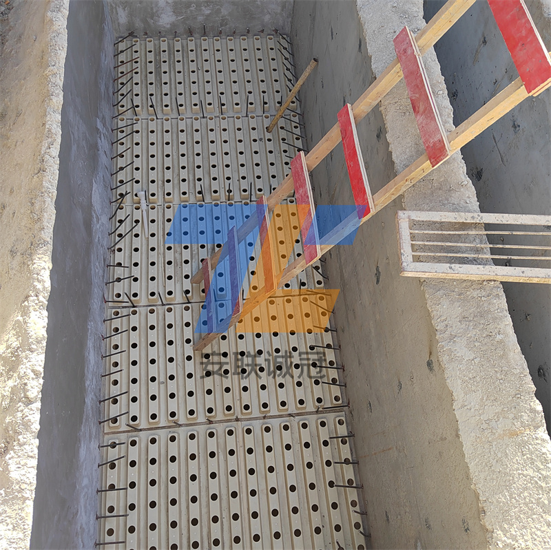 整體濾板模板,用于濾池中安裝可調式濾頭并在池內可完成整體澆筑鋼筋混凝土的專用ABS濾板,這是一種采用ABS工程塑料制成的楞型板,以確保澆筑時模板的強度,凸面上開有帶頸套的圓孔,主要用以固定可調式濾頭的預埋座安裝。