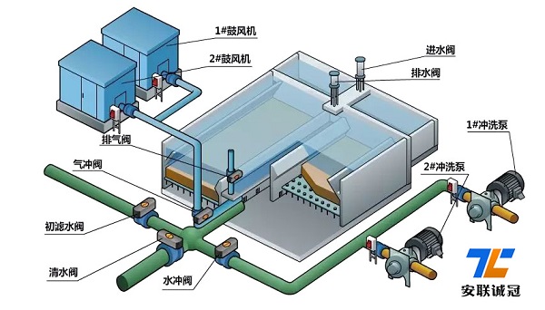 (2)氣、水反沖再加始終存在的橫向表面掃洗,沖洗水量大大減少