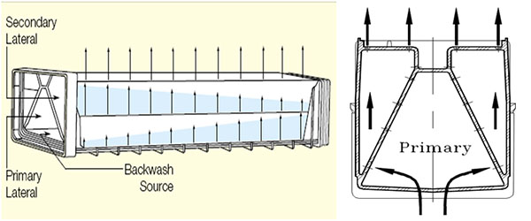 二次配水設計確保了水和氣體在更長的濾磚長度上的每一個擴散孔處均勻分布。在 “S型”濾磚中,反沖水由一級分配腔進入濾磚,因為在距反沖洗進口遠的地方有更多的水和氣從開孔處流出,導致一次配水腔配氣配水不均勻。一次配水腔流出的不平衡水流在二次配水腔產生逆向水流,從而形成補償使得沿濾磚長度方向上終的整體壓力均勻。為濾床反沖洗提供非常均勻平穩無盲區的反沖洗水,提高反沖洗效率,延長濾池運行周期。