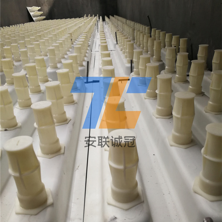整體濾板模板采用現場整體連續澆筑混凝土工藝,可使濾板無接縫,克服了傳統小塊預制濾板可能存在濾板接縫密封不嚴的隱患,杜絕了翻板、漏砂等弊病,縮短了工程周期,降低了工程造價,具有明顯的經濟效益。整體濾板模板常用規格及適用范圍 整體濾板模板采用工程塑料ABS制成的楞型板,凸臺上開有帶頸套的圓孔用以固定可調式濾頭的預埋座,出廠整體濾板模板表面平整,無開裂、縮痕、氣泡、溢邊等缺陷。配置濾頭:專用可調節濾頭。現場整體澆筑濾板鋼筋與混凝土質量易于控制,施工周期短,徹底改變了傳統混凝土濾板一模一板的落后加工工藝,且便于現場進行監督和質量檢查。