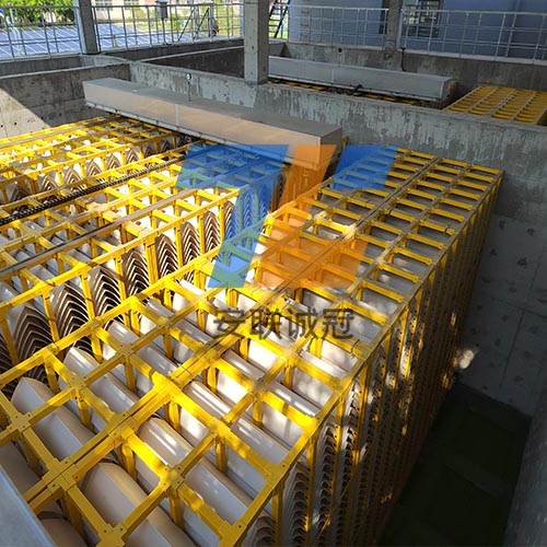 3.傾角設(shè)計(jì):?jiǎn)蝹?cè)斜板與水平面夾角一般為 55°~60°,符合“淺池理論”優(yōu)沉降角度,利于污泥滑落。